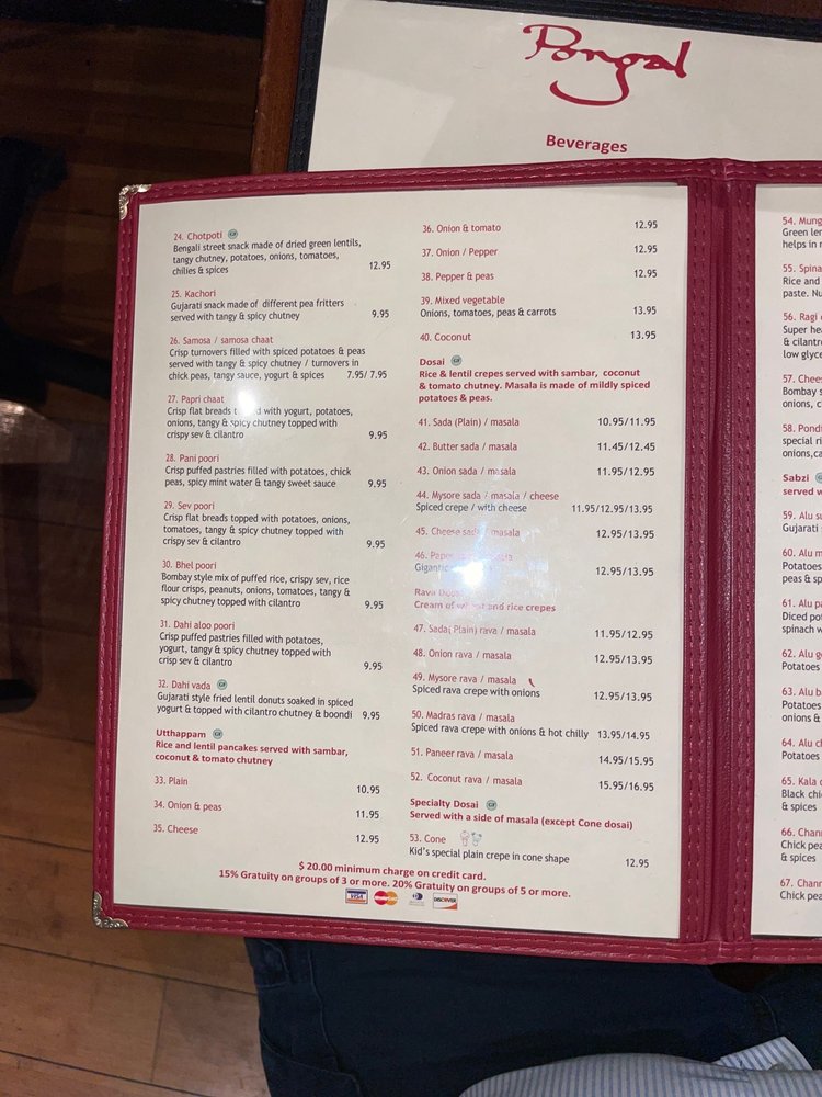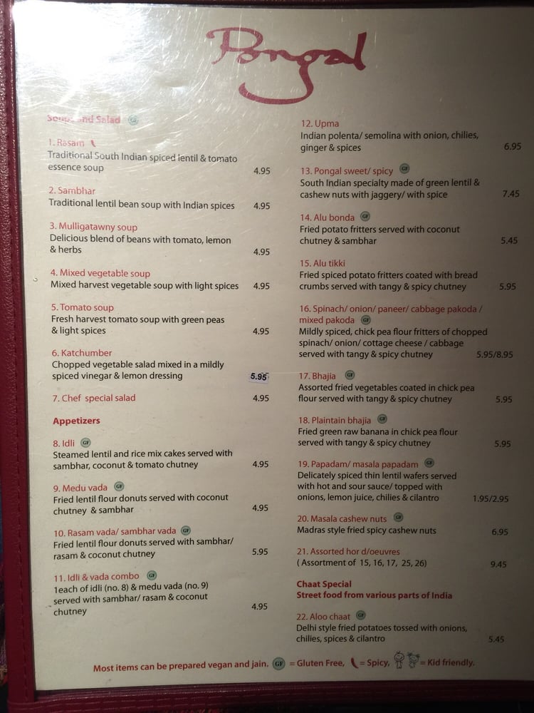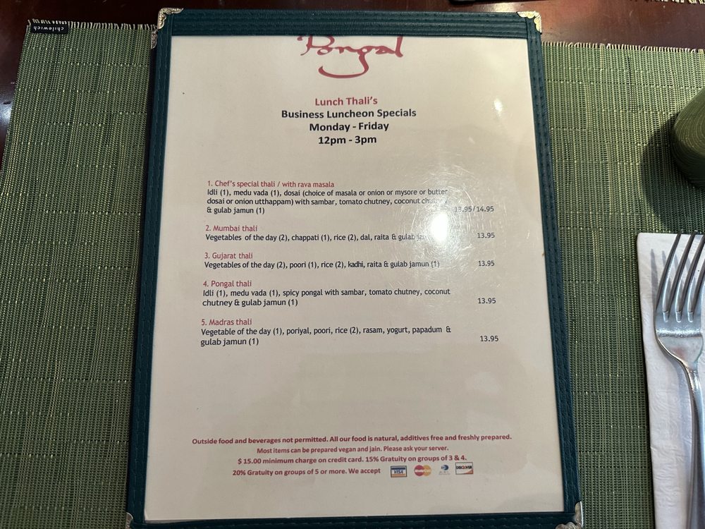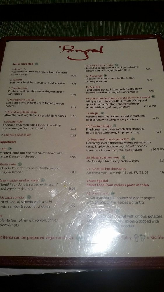 Pongal, a vegetarian Indian dessert spot in Manhattan, offers a diverse menu and cozy ambiance. Customer reviews rave about the unique dishes like Pani Poori and Gujarati Thali, highlighting the perfectly seasoned flavors and inviting service. The saffron, cardamom, and pistachio yogurt stand out as a favorite dessert option. Other popular choices include the Rava Mysore Masala Dosa and the flavorful Moru drink. The friendly staff, energetic atmosphere, and delicious food make Pongal a top choice for authentic Indian cuisine in NYC. Make sure to try their rose lassi, samosas, and dosas for a memorable dining experience.